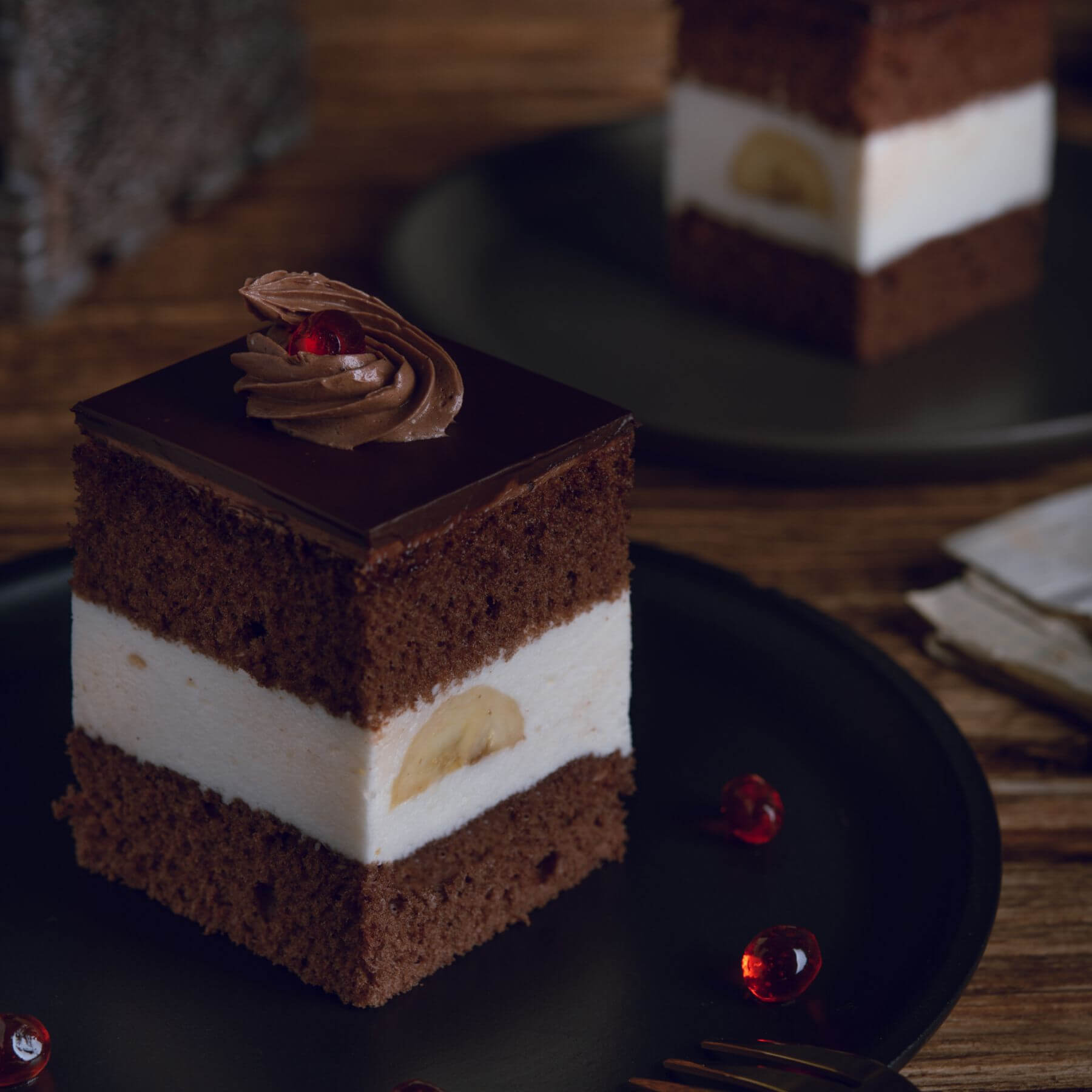 Nasz niezwykły bananowiec to prawdziwa uczta dla smakoszy poszukujących intensywnych i autentycznych smaków. W każdym kęsie odnajdziesz wyjątkowe połączenie - dojrzałe banany zanurzone w delikatnej śmietanie o intensywnym smaku bananowym, ukryte pomiędzy dwoma warstwami ciemnych biszkoptów.