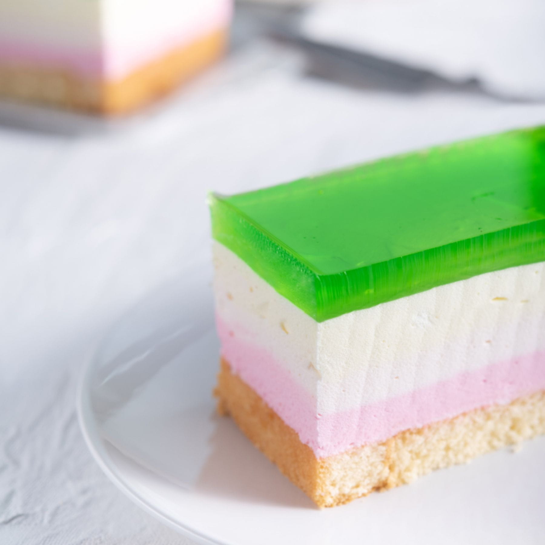 Nasze ciasto Trójsmak to prawdziwa uczta dla podniebienia. Przygotowany na jasnym biszkopcie, ten wyjątkowy deser składa się z trzech warstw delikatnej śmietany, każda z nich nasączona jest aromatyczną galaretką o innym, intensywnym smaku.