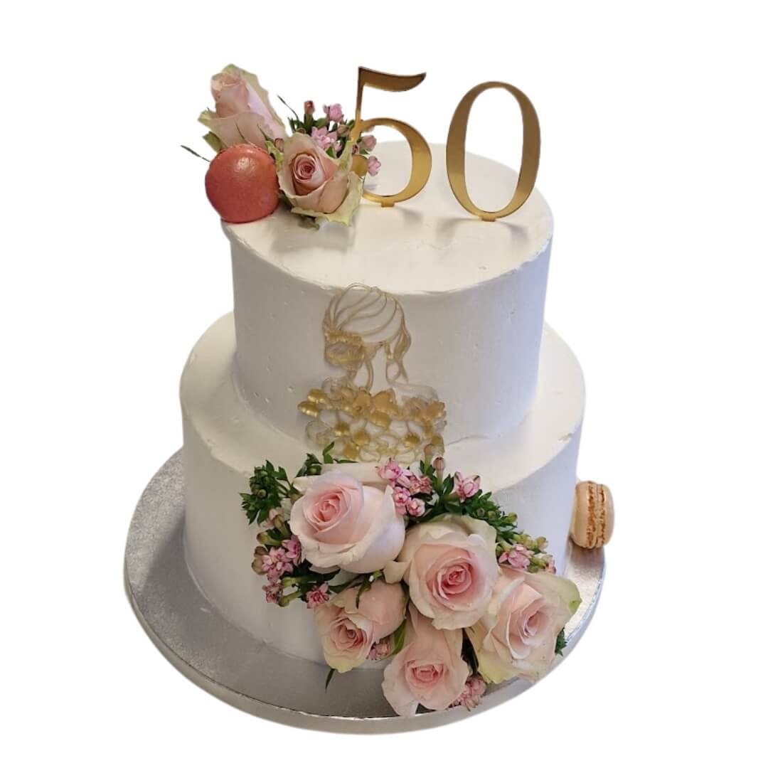 Tort piętrowy biały wzór Tzk24 | makaroniki i różowe róże