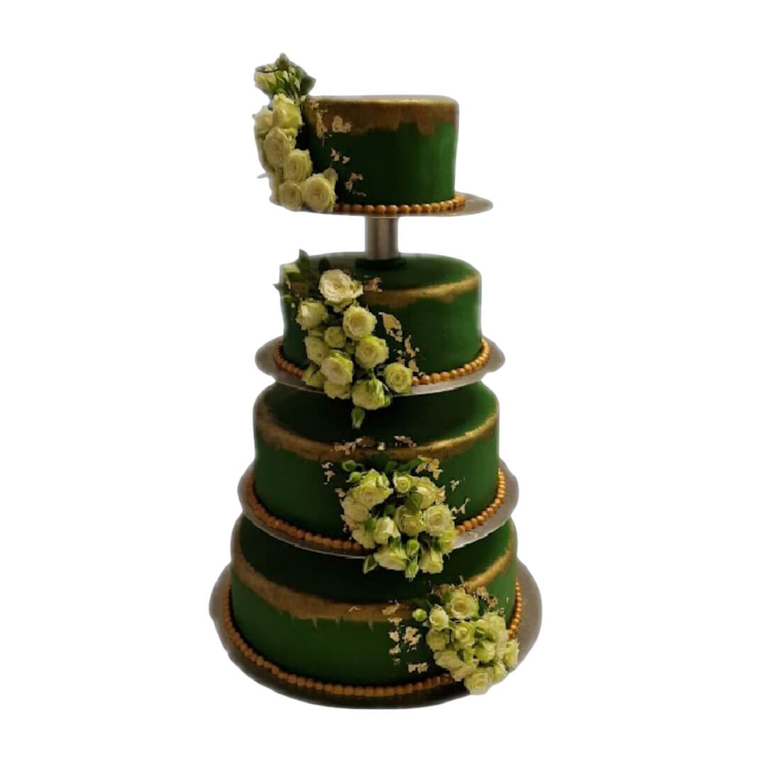 Niezwykle oryginalny tort weselny w odcieniach butelkowej zieleni, umieszczony na efektownym stelażu z czterema poziomami. Każde piętro zdobione jest ręcznie złoconymi akcentami oraz naturalnymi zielonymi różami, tworząc wysmakowaną i wyjątkową kompozycję.