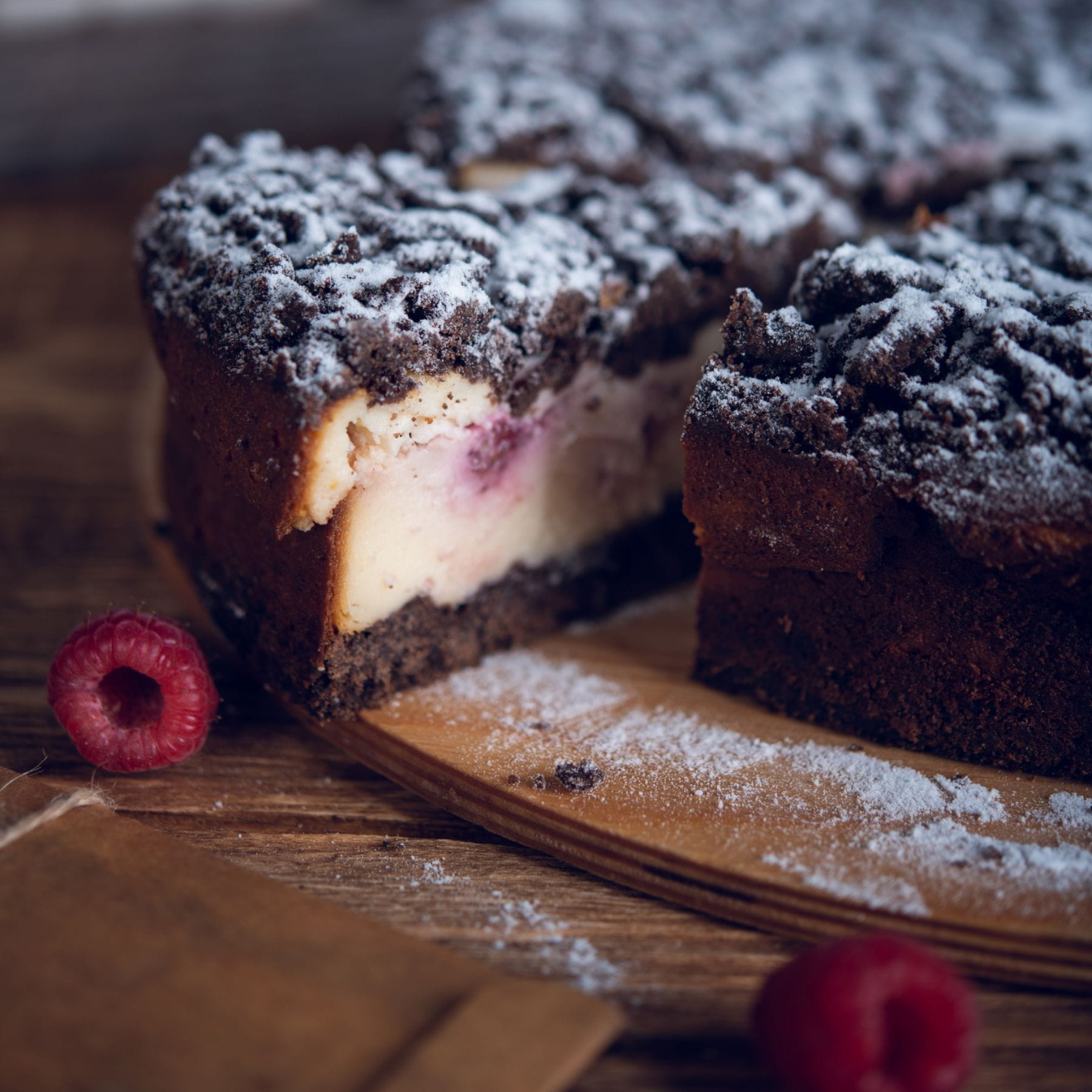 Nasz wyjątkowy Sernik pieczony z malinami to prawdziwa uczta dla podniebienia. To połączenie intensywnego smaku malin z delikatną słodyczą sernika, wszystko umieszczone na kakaowym kruchym spodzie, a całość ozdobiona apetyczną kakaową kruszonką.