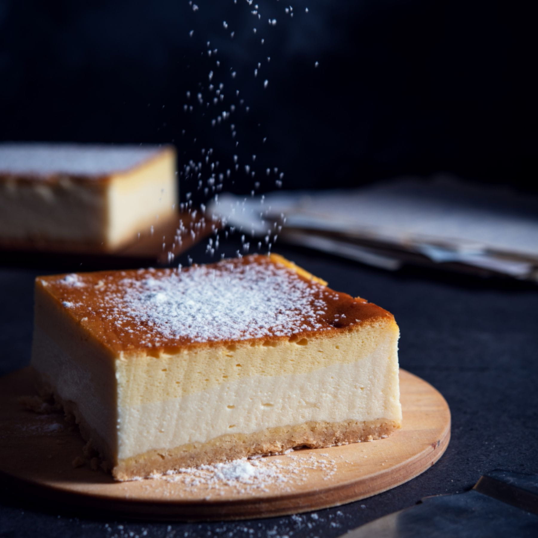 Na górze sernika znajduje się delikatna posypka z cukru pudru, która nadaje mu wyjątkowego uroku wizualnego i lekkości w smaku. To doskonałe zwieńczenie tej wyśmienitej kompozycji smakowej.