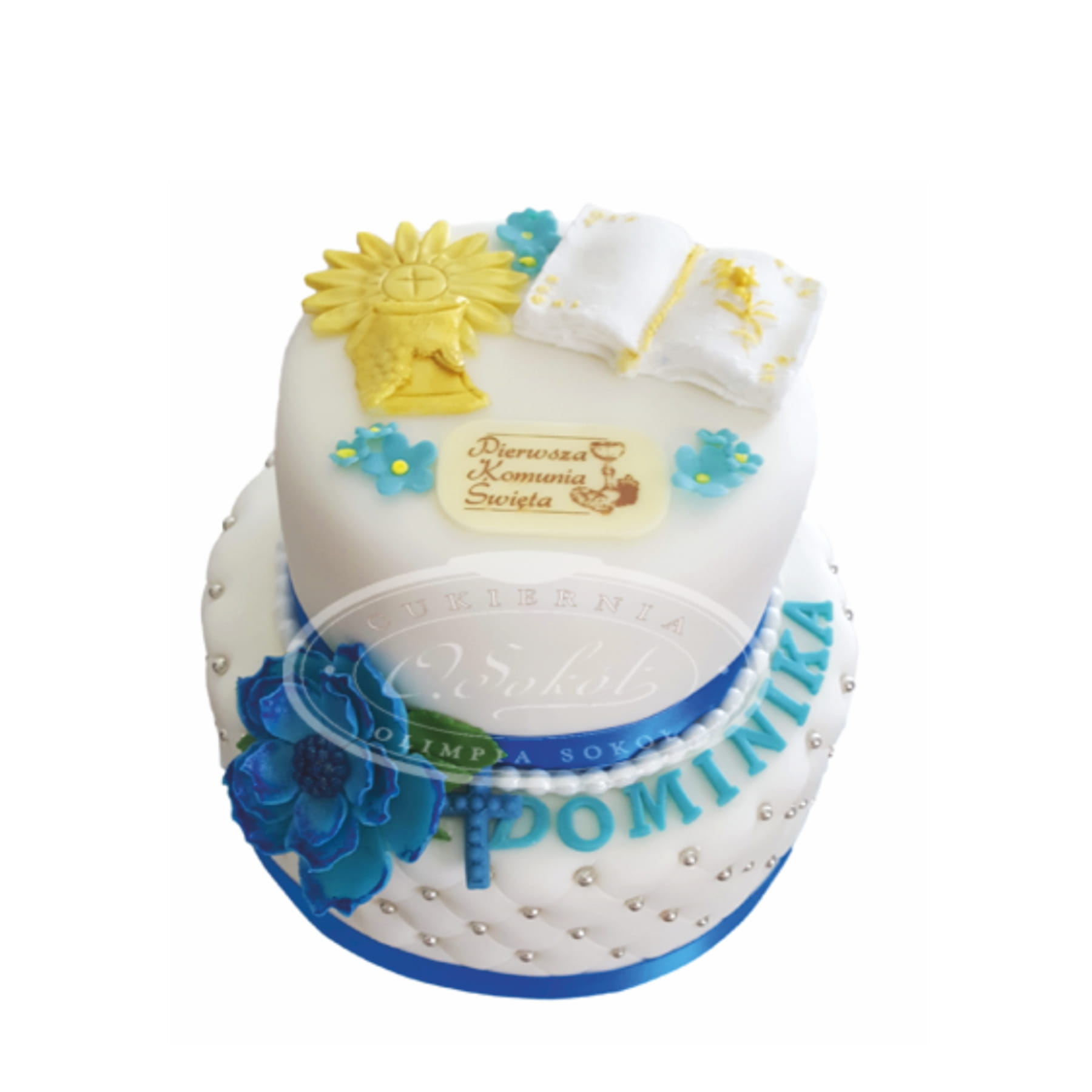 Tort komunijny wzór Tk32 | złoty kielich z książką komunijną i niebieskimi kwiatami