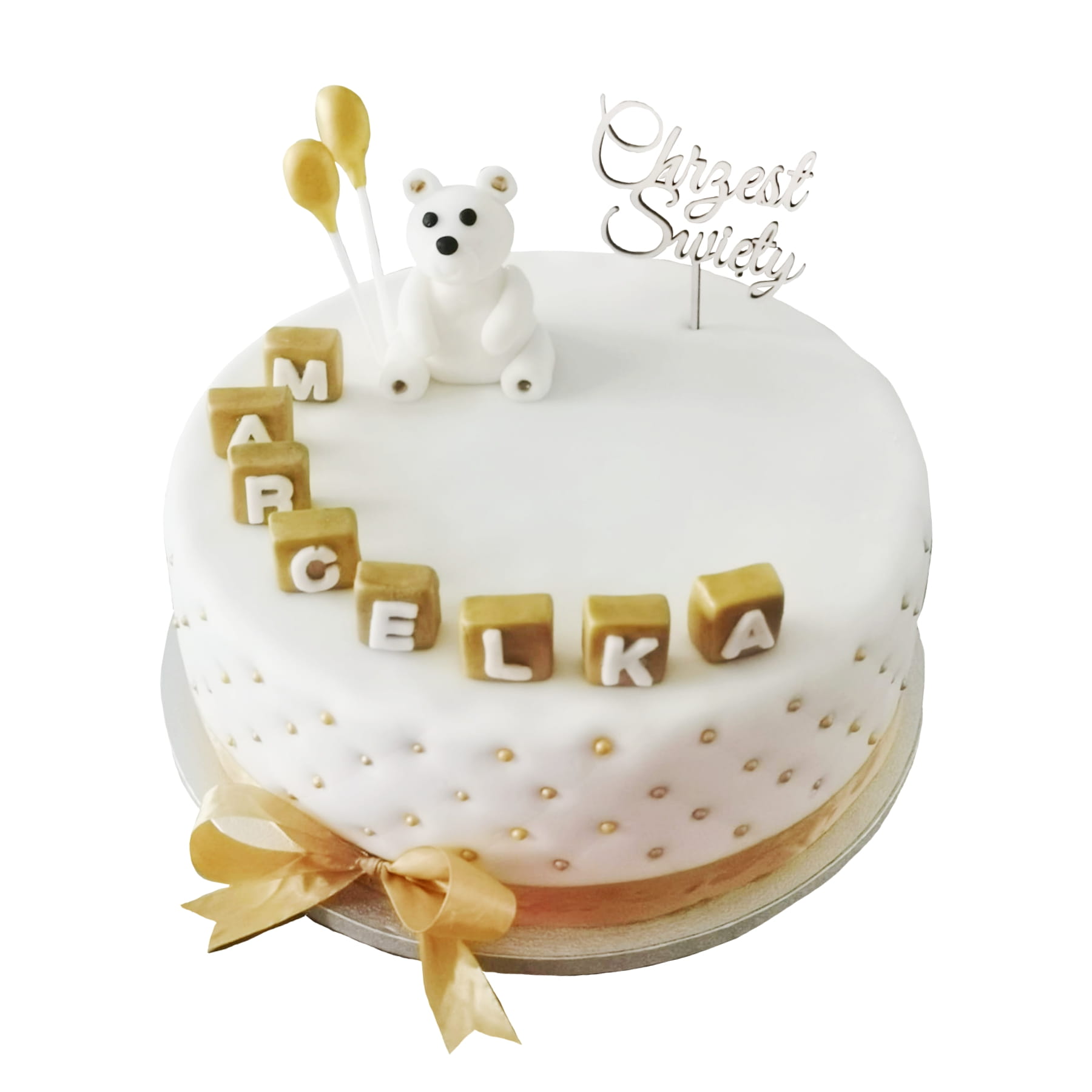 Tort na Chrzest Święty wzór Tch18 | biały miś ze złotymi balonikami