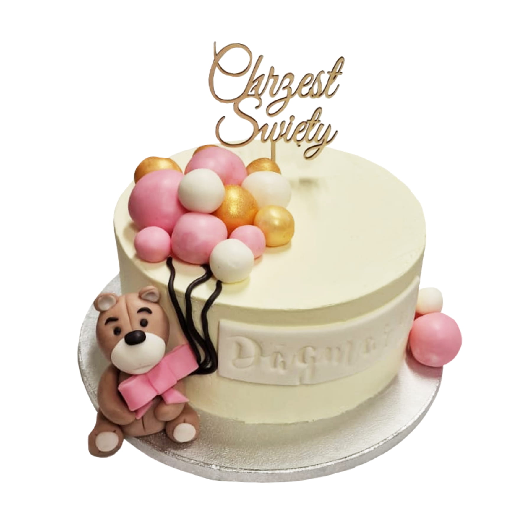 Tort piętrowy na Chrzest Święty wzór Tch12 | miś z różowymi balonikami