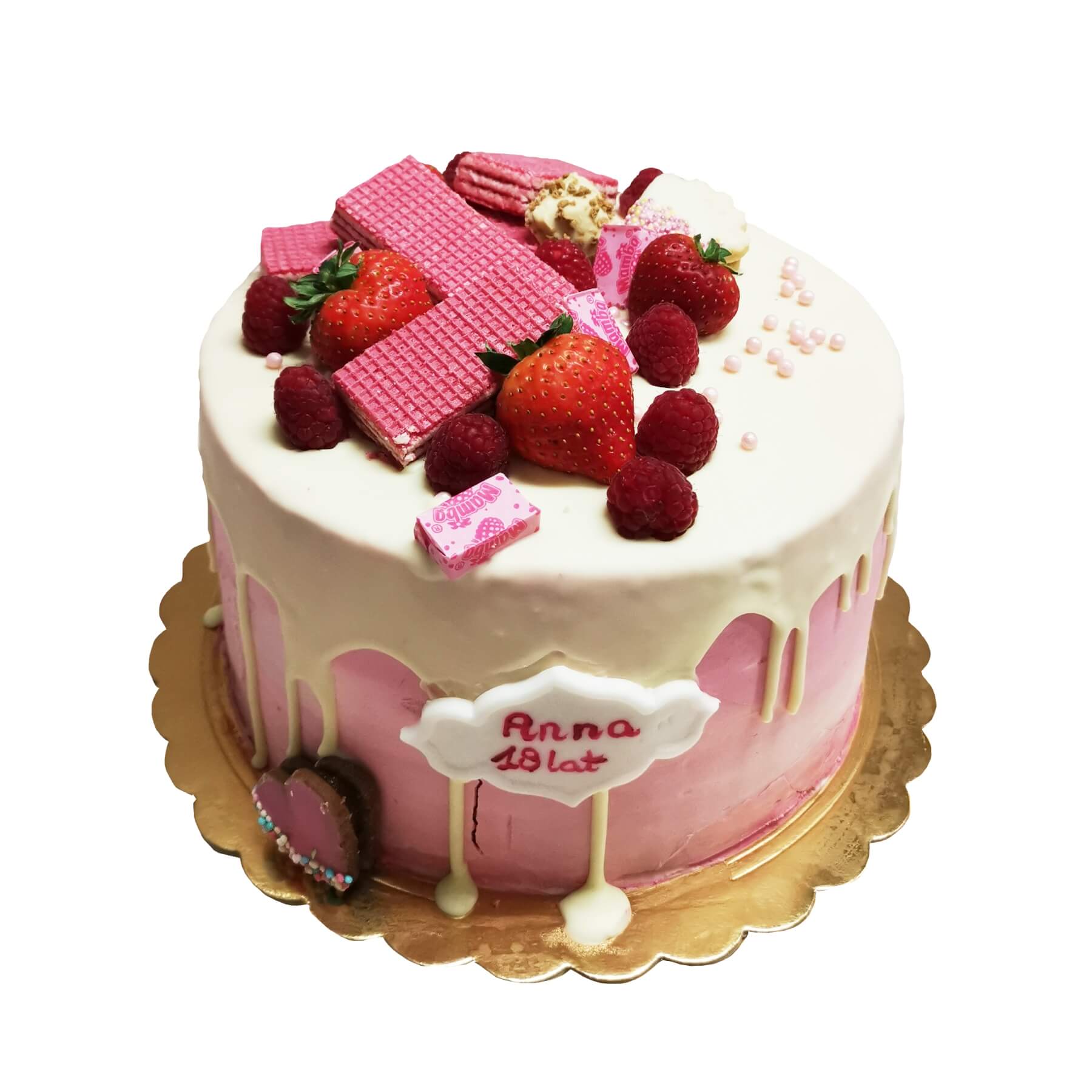 Tort urodzinowy różowy wzór Tm26 | Drip Cake, 18 urodziny z truskawkami