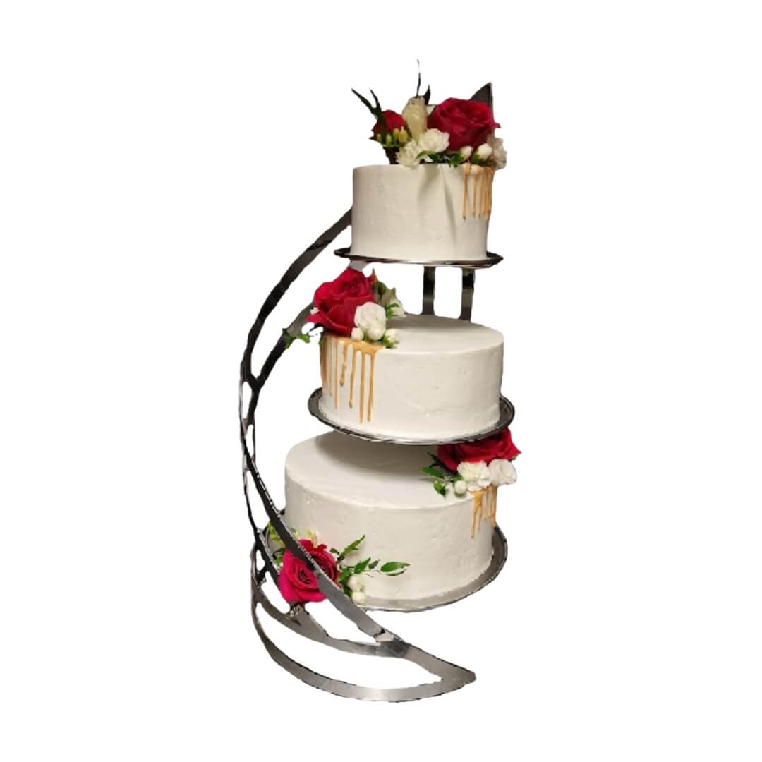 Nowoczesny tort weselny o lekkim i stylowym wyglądzie, zaprezentowany na finezyjnym metalowym stelażu w spiralnym układzie. Trzy osobne piętra o gładkiej białej fakturze zdobią subtelne złote zdobienia typu „drip” oraz świeże kompozycje kwiatowe z czerwonych róż, białych goździków i delikatnych frezji.