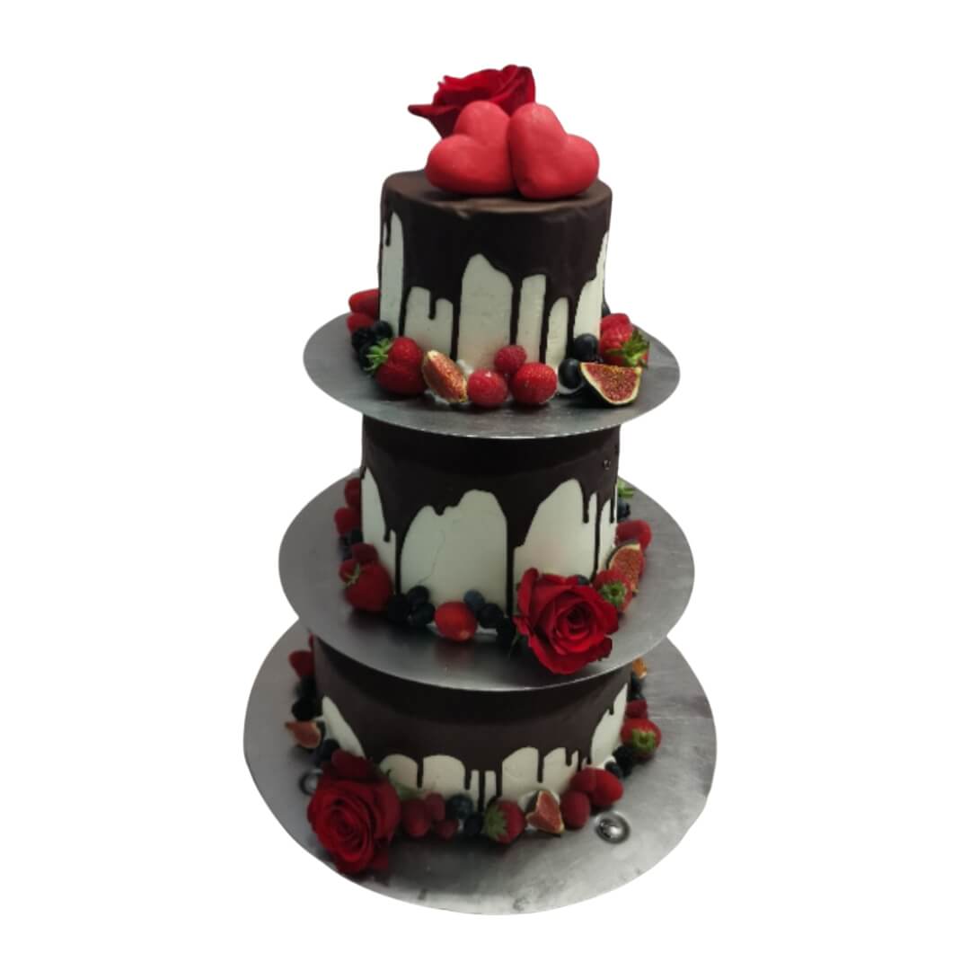 Ten trójpoziomowy tort weselny to połączenie elegancji, świeżości i wyrazistego smaku. Każda warstwa ozdobiona została czekoladową polewą typu „drip”, soczystymi owocami sezonowymi i świeżymi czerwonymi różami – całość tworzy wyjątkowo apetyczną i efektowną kompozycję.