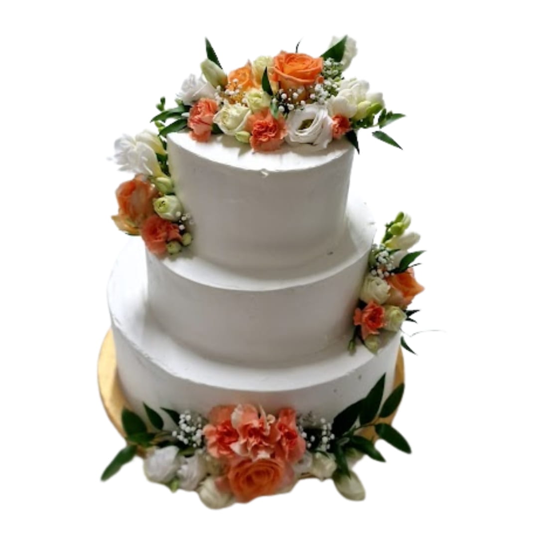 Tort weselny piętrowy biały wzór Tzk20 | pomarańczowe, kremowe i białe kwiaty