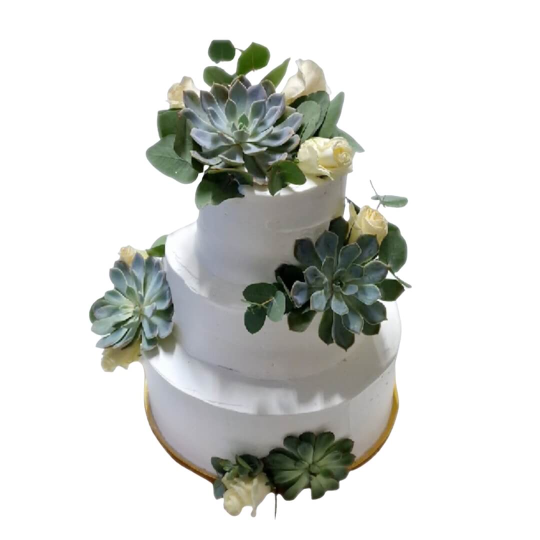 Tort weselny piętrowy biały wzór Tzk19 | kremowe róże i sukulenty