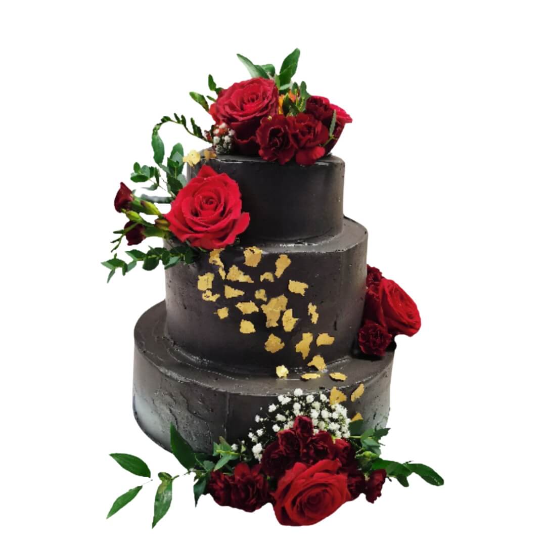 Tort weselny piętrowy czekoladowy wzór Tzk09 | czerwone róże z płatkami złota