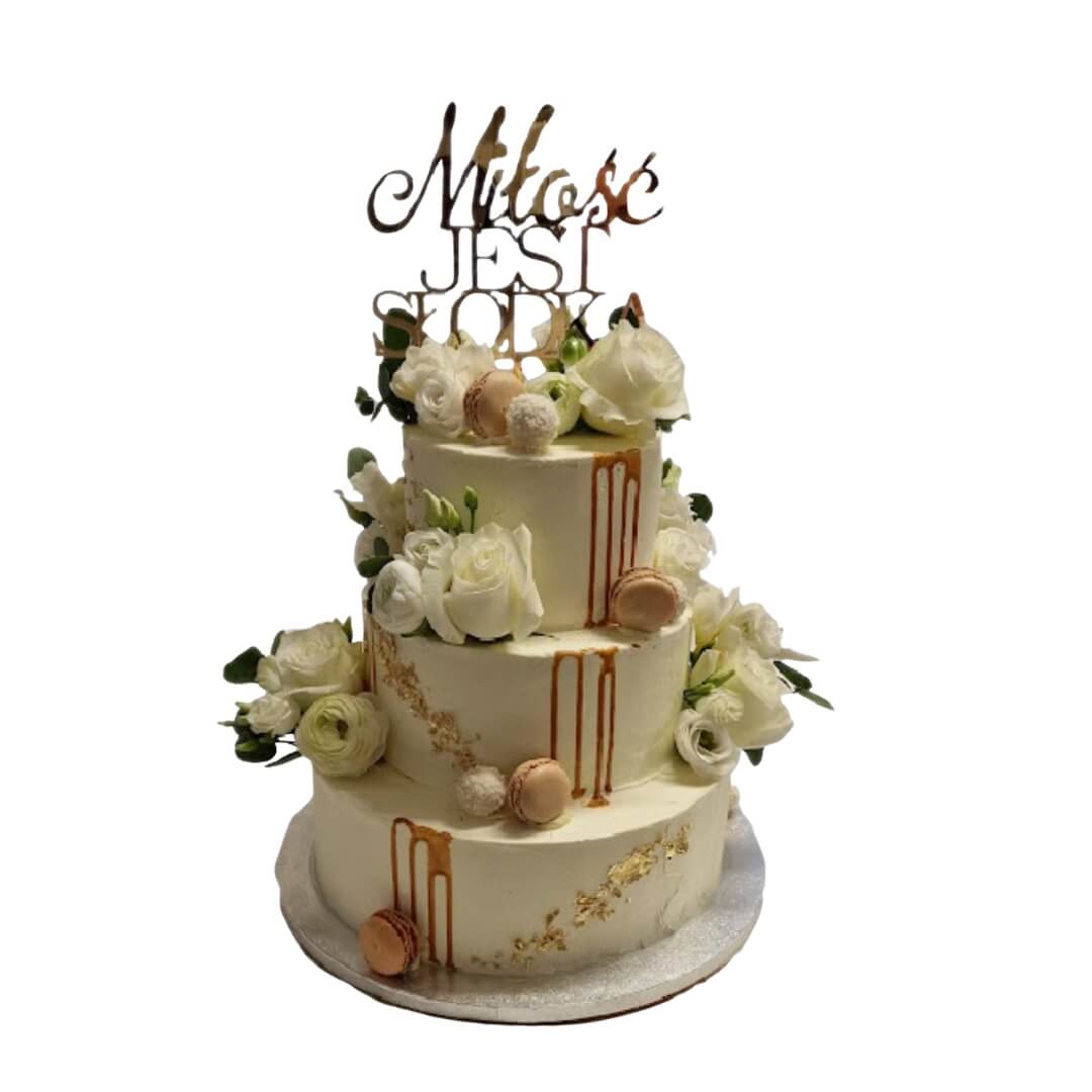 Tort weselny piętrowy wzór Tzk27 | makaroniki, złoto i żywe kwiaty