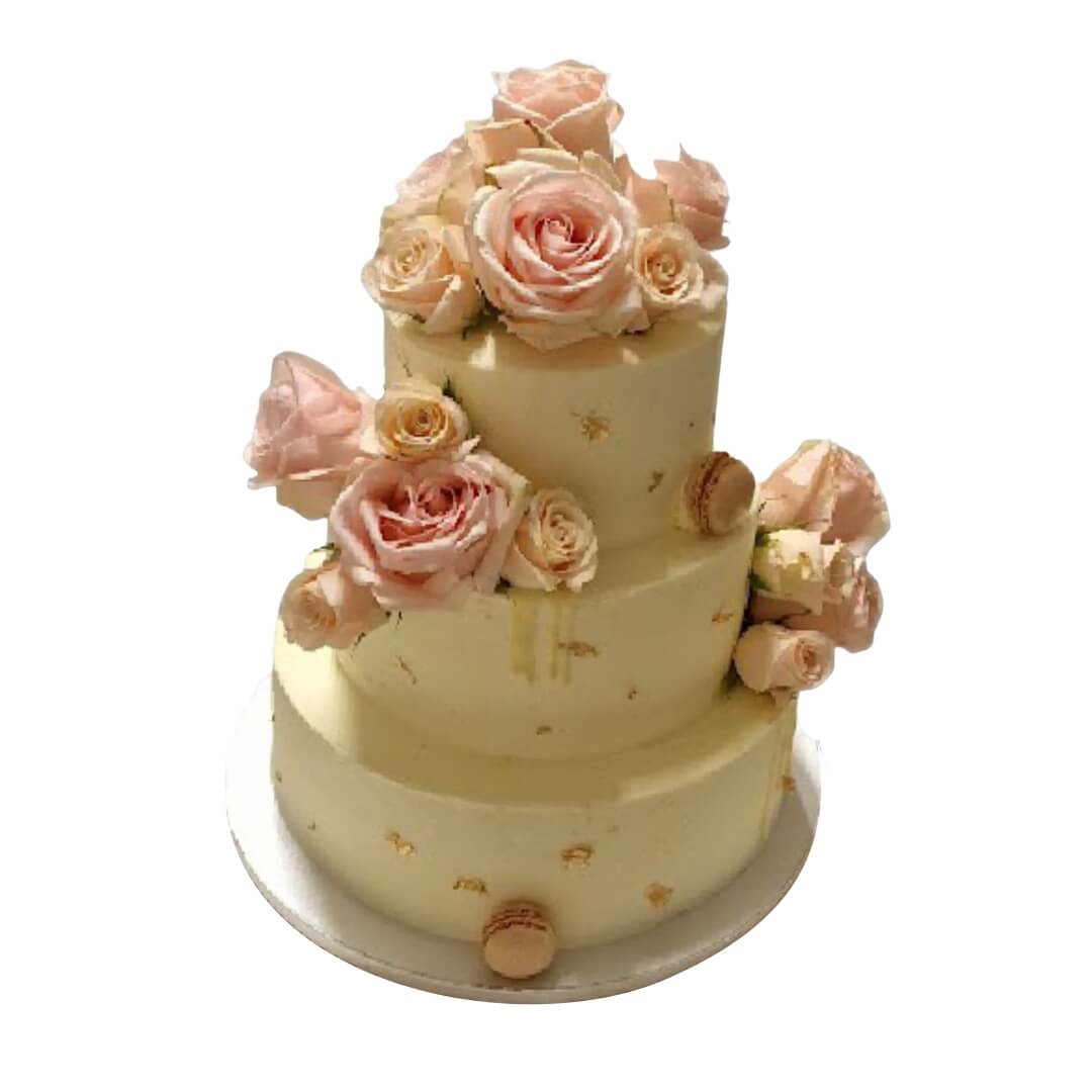Tort weselny piętrowy wzór Tzk33 | makaroniki, pudrowe róże i złoto