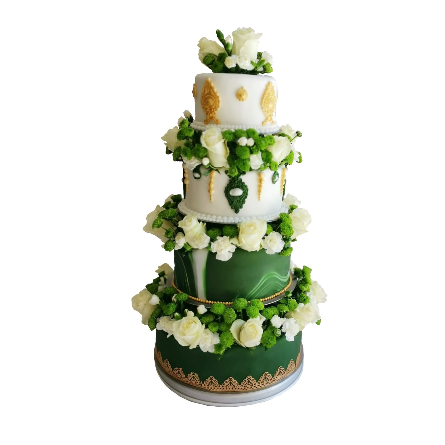 Tort weselny piętrowy zielony z koronką wzór Tzk37 | białe róże, złote ornamenty