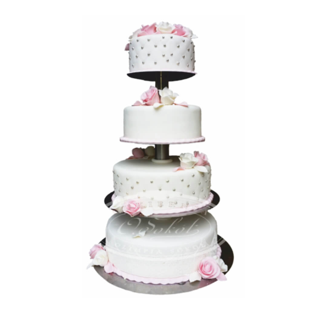 Czteropiętrowy tort weselny o ponadczasowym uroku i subtelnej kolorystyce, który zachwyca elegancją i delikatnością. Biała baza tortu z drobnym pikowaniem, ozdobiona ręcznie robionymi różami w odcieniach bieli i różu, tworzy wyjątkową kompozycję – idealną na ślub marzeń.