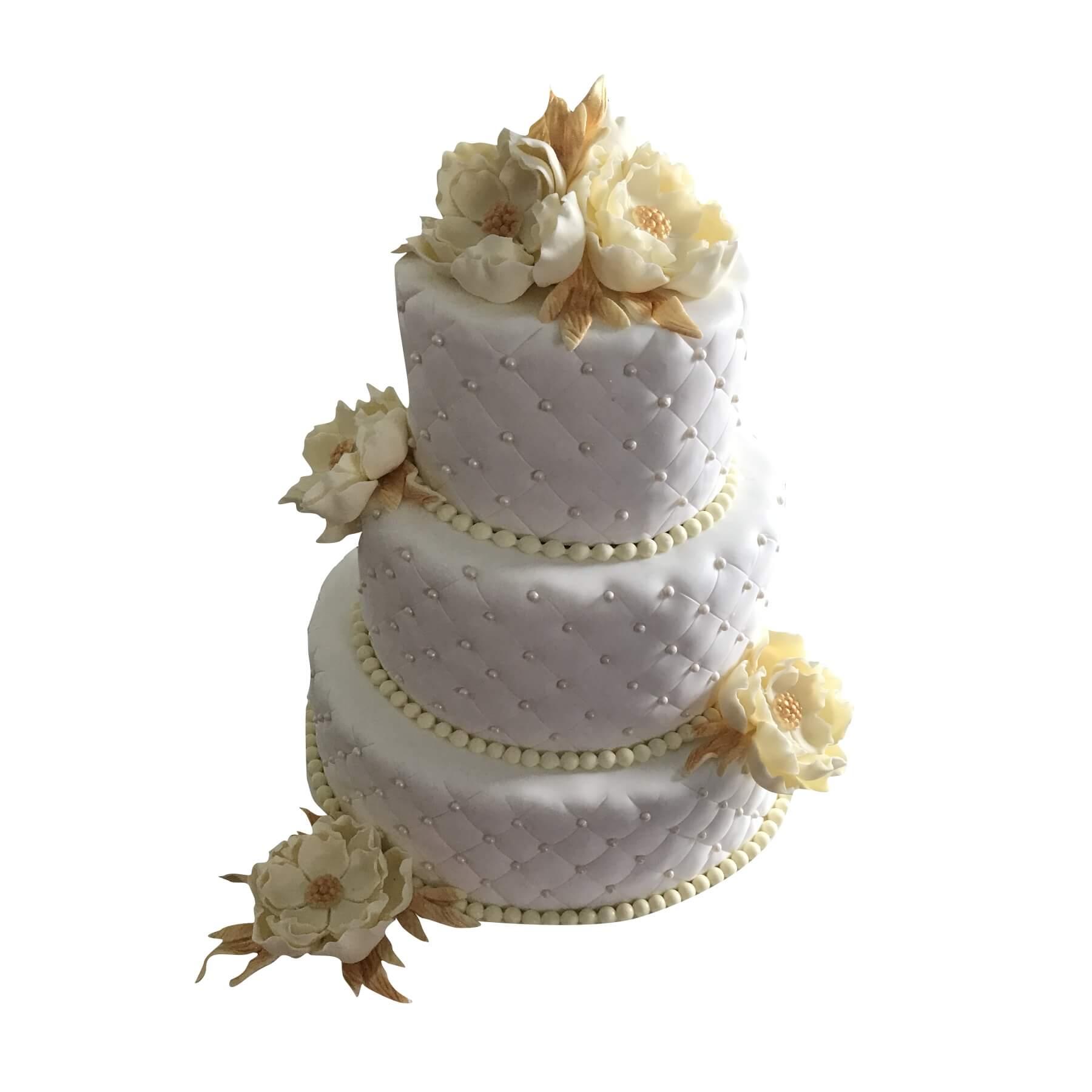 Tort weselny pikowany biały wzór Tp04 | kremowe piwonie, złote liście