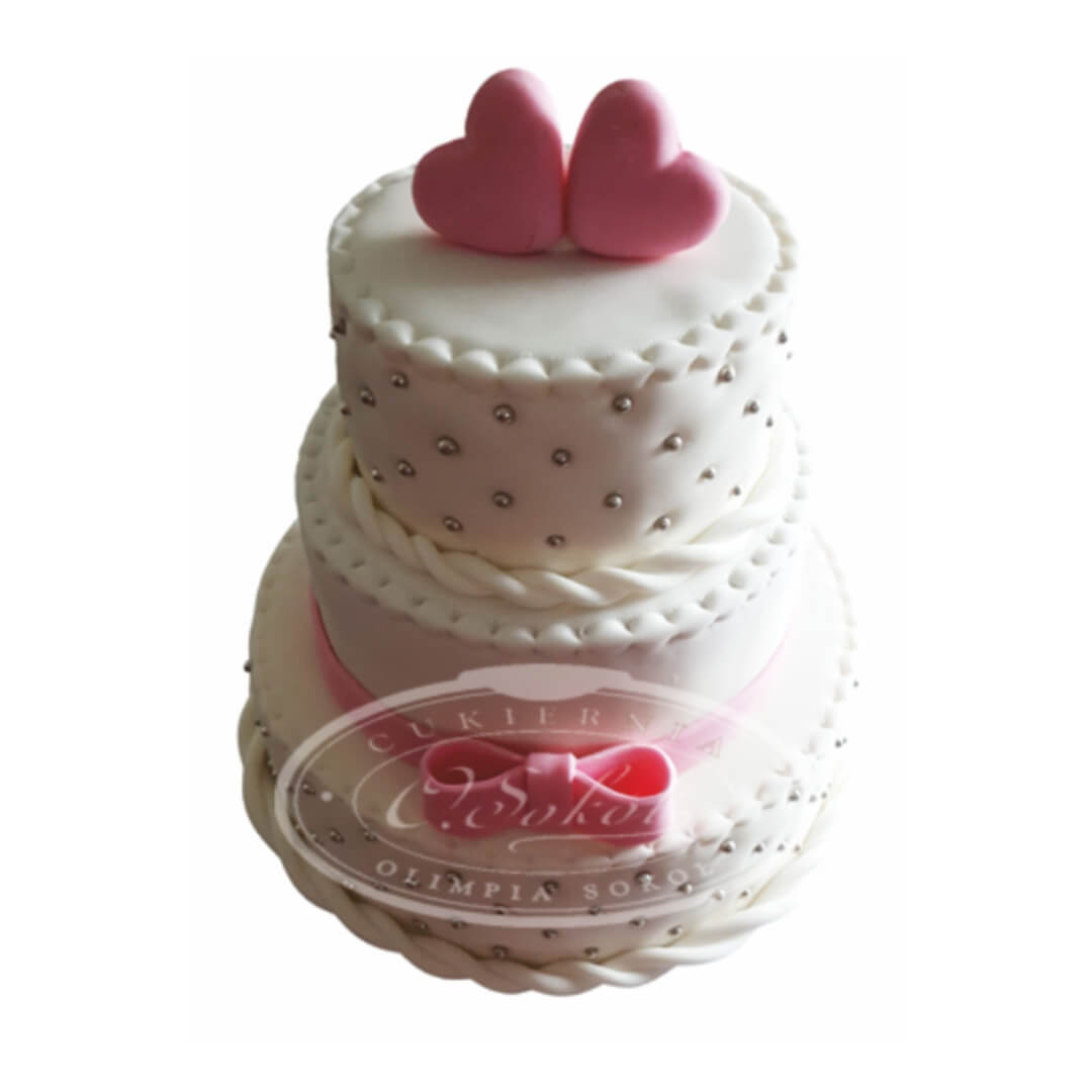 Dekoracyjne serduszka z masy wieńczą górę tortu, symbolizując miłość i jedność. U dołu tortu znajduje się delikatna różowa kokarda – uroczy akcent, który przełamuje biel i dodaje całości lekkości oraz wdzięku. Połączenie tych detali sprawia, że tort staje się prawdziwą ozdobą stołu weselnego.