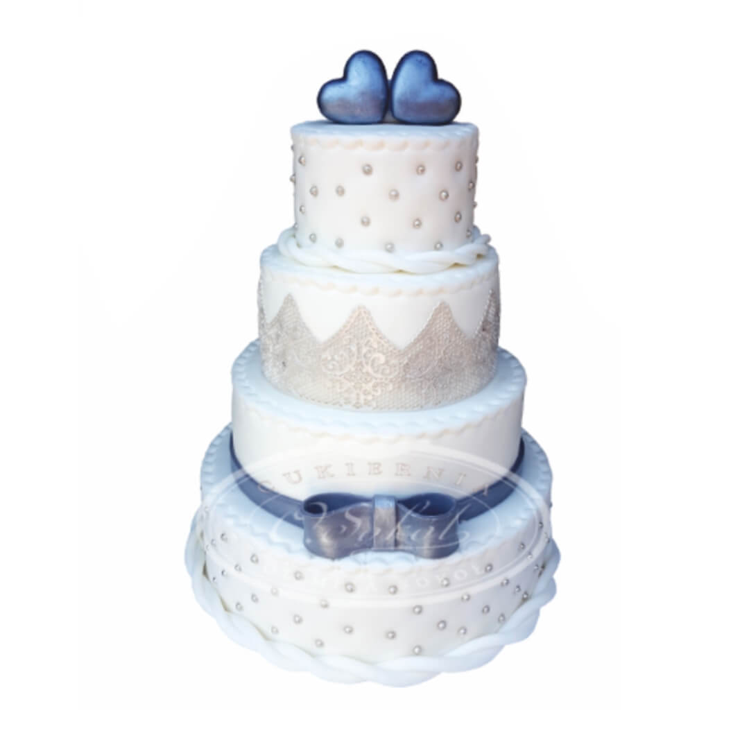 Tort weselny pikowany biały wzór Tp16 | niebieskie serca, koronka i kokardka