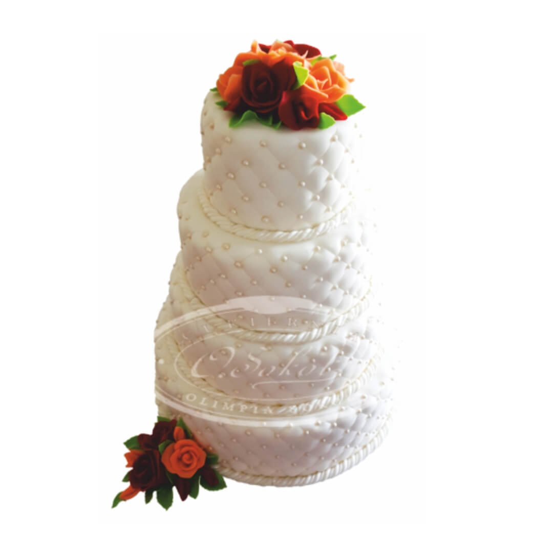 Ten wyjątkowy dzień zasługuje na równie wyjątkowy tort. Przedstawiamy elegancki, czteropiętrowy tort weselny w białej oprawie, ozdobiony pikowaną fakturą, jadalnymi perełkami oraz bukietem ręcznie wykonanych róż w odcieniach pomarańczu i bordo. To idealna propozycja na ślub o każdej porze roku – a szczególnie jesienią.