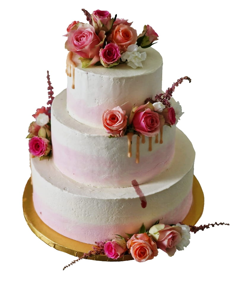 Tort weselny piętrowy Ombre to połączenie subtelnych odcieni różu, które symbolizują piękno i głębię uczucia miłości. Efekt ombre - stopniowe przechodzenie kolorów od jasnych do ciemniejszych - sprawia, że tort emanuje wyjątkowym wdziękiem i romantyczną atmosferą.